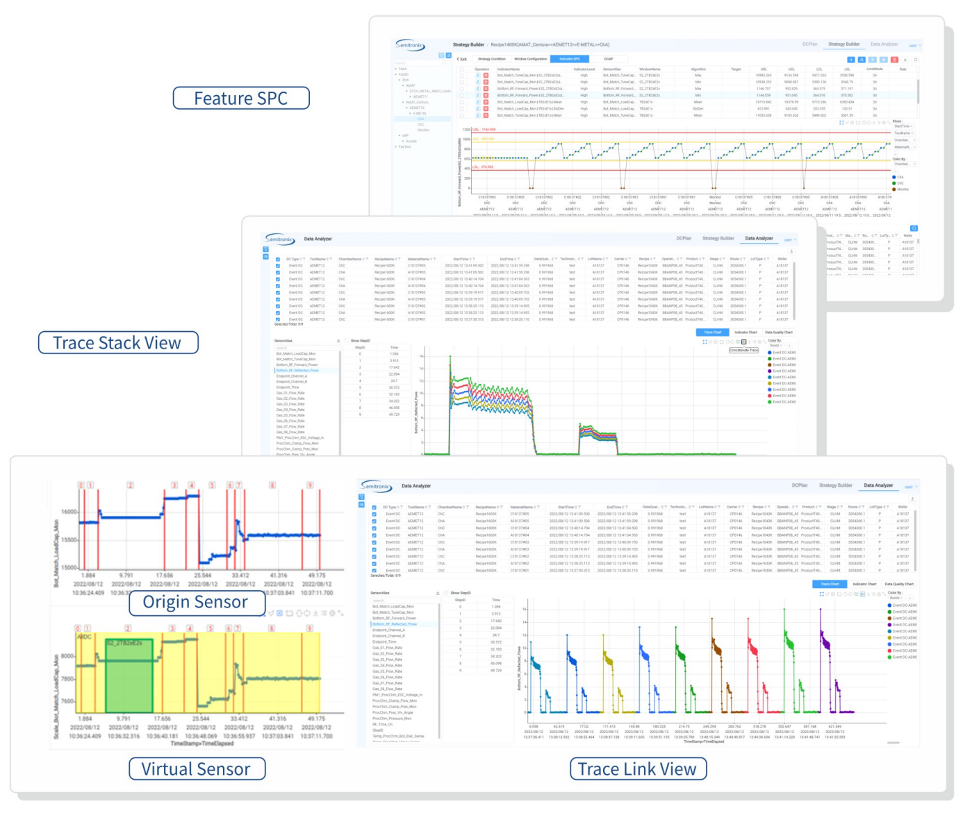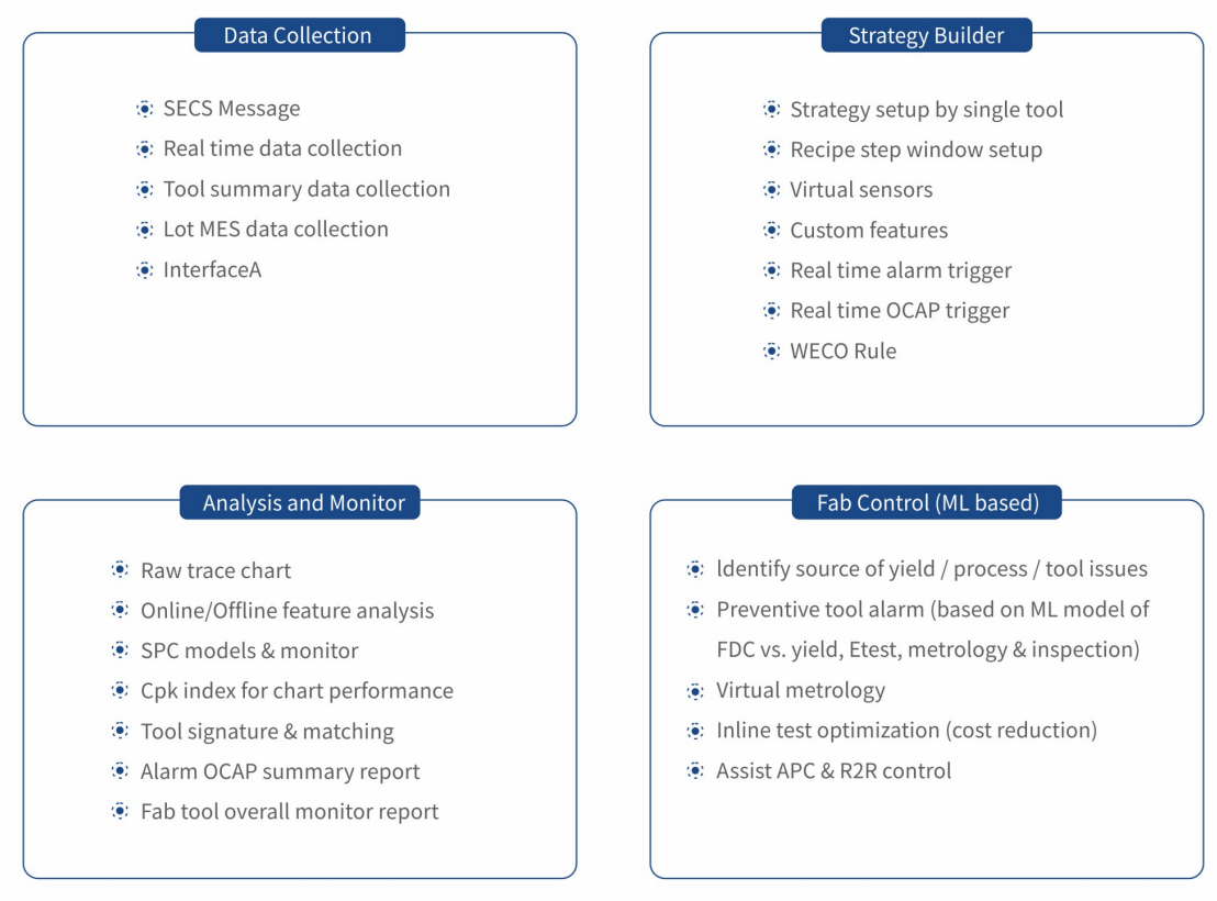 在制造过程中,设备效率和稳定性及工艺的一致性是确保高产品质量和产量的重要因素。8827太阳集团DataExp-FDC(简称DE-FDC)系统与设备及MES建立通讯,收集设备中传感器的 Raw Trace数据,并从中提取有效表征因子,监控整个生产过程中的设备运行,提供预警和实时调优,保证生产工艺的稳定性。同时FDC收集的大量设备数据和良率分析系统 (YMS)结合,通过大数据机器学习可以帮助快速找到良率问题的根因,并反馈到产线及时修正。除此之外,与Inine量测建立的有效模型,使Fab可及时调整采样策略,减少CycleTime和优化测量设备使用,在保证监控灵敏度的同时降低成本。