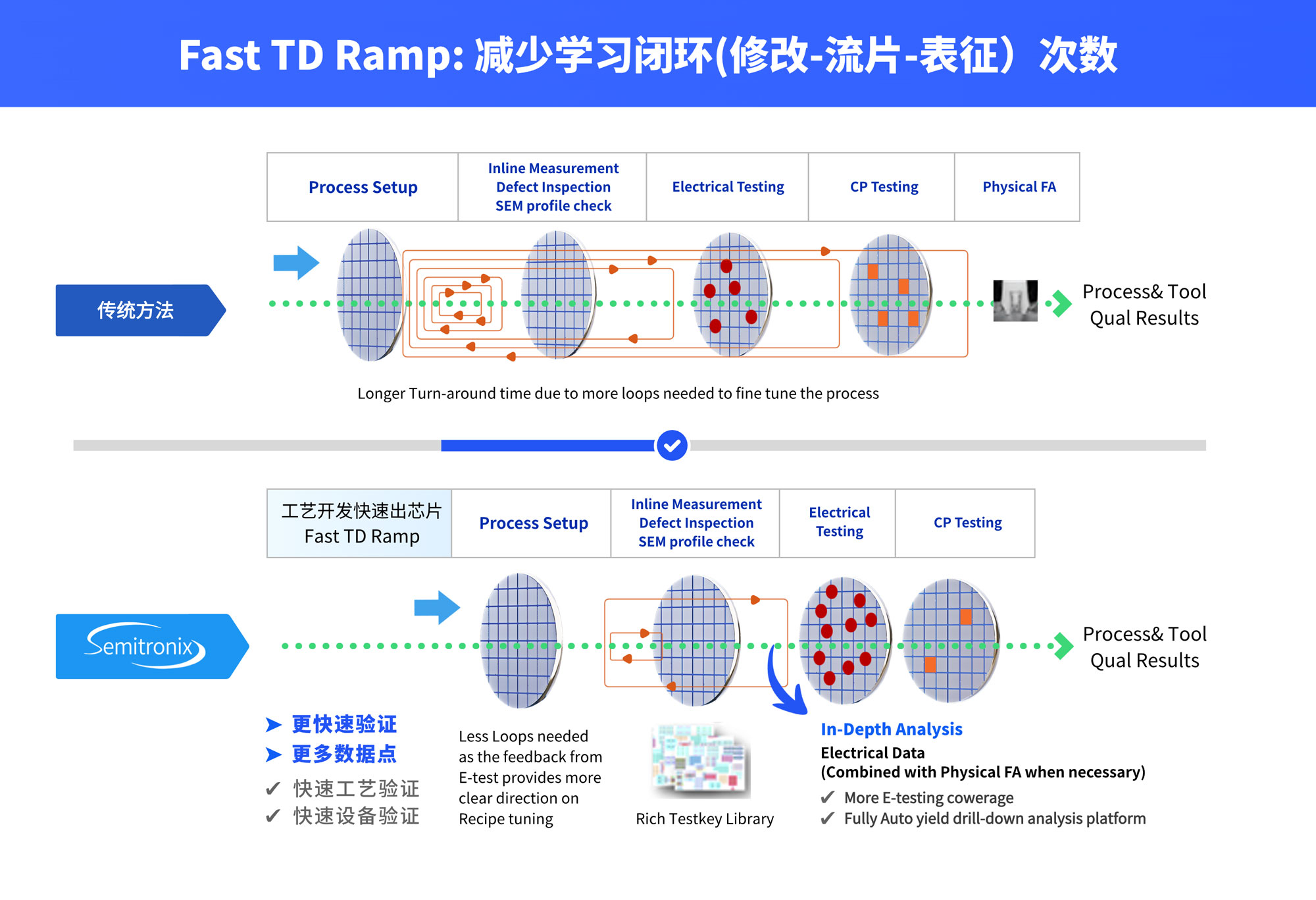 8827太阳集团技术核心在于挖掘提升数据驱动效率的方法论。以工艺开发为例,传统的工艺开发流程主要通过产品测试分辨失效根因,而先进的测试芯片方法,能通过全面、系统的DoE参数设计,通过电性监控,解耦定位到根因工序。结合Failure Analysis等常用手段,可以更全面的表征问题,发现问题,缩短流片学习周期。