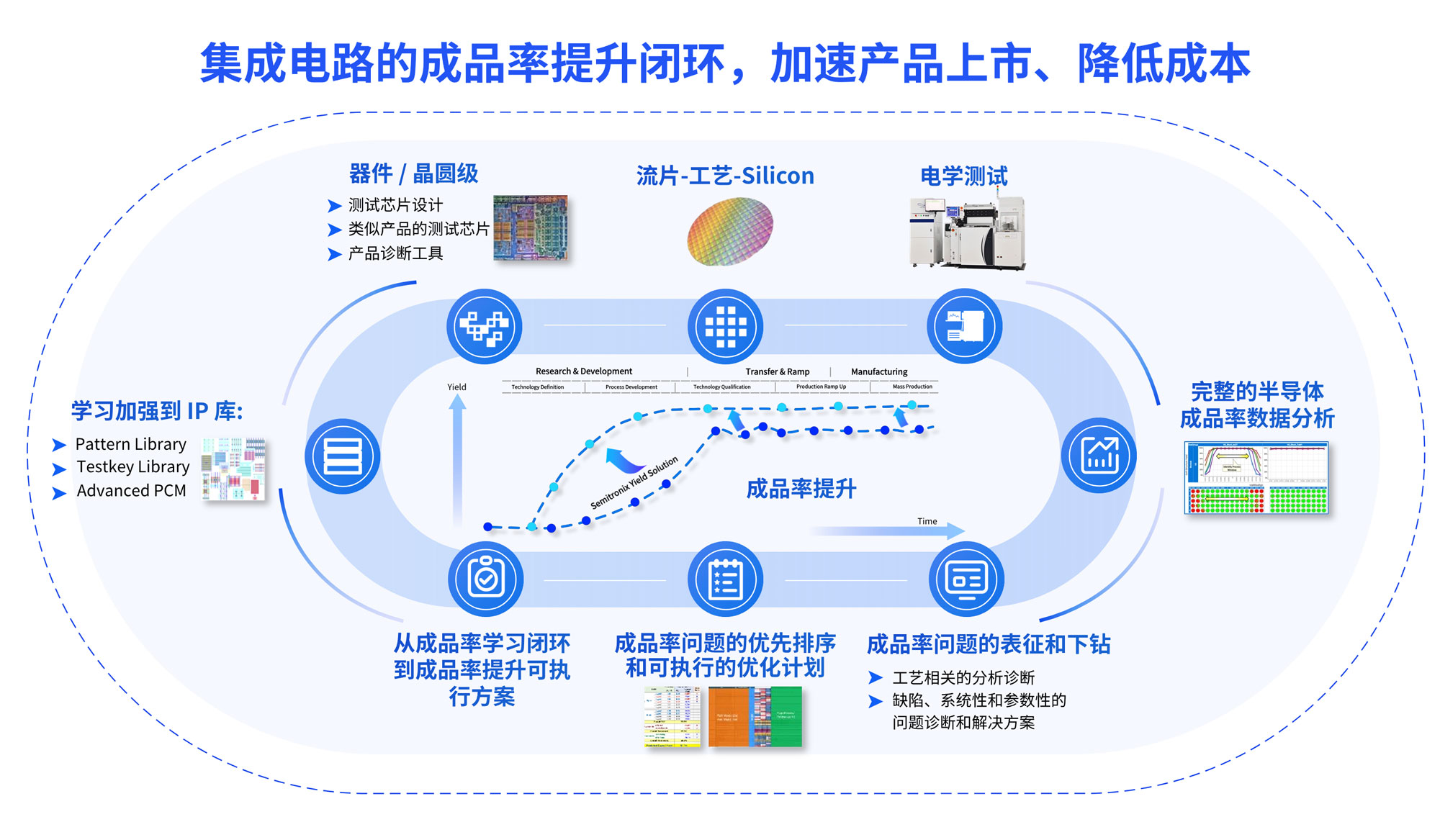 8827太阳集团针对高效的工艺开发的服务解决方案,为晶圆厂加快研发速度,提升量产成品率和稳定性。在工艺开发不同阶段的工具组合,从初期工艺搭建,产品试生产到量产监控,准备了包含设计、测试和数据整合分析方案。在大量实践项目中,为合作晶圆厂的工艺保驾护航。