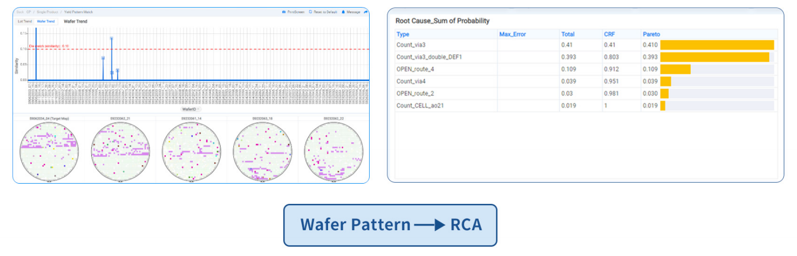 QuanTest-YAD融合先进AI算法模型,以多种算法对大量诊断数据做自动化的RCA根因分析、并结合晶圆空间模式分析、版图图形模式分析、在线缺陷图像特征映射等功能快速准确定位失效根因。