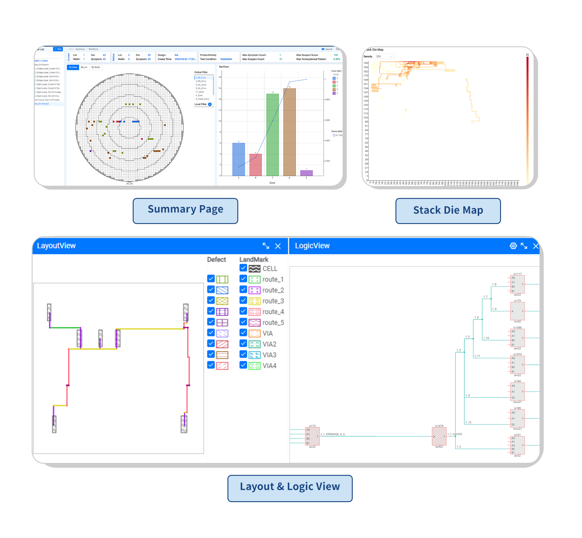 通过树形目录形式层级展示用户根因分析流程,通过DataCard、Dielnfo、WaferMap、Stack Die、Report、Logic View、Lavout View等视图,且灵活支持数据关联分析,帮助用户快速高效进行诊断分析。